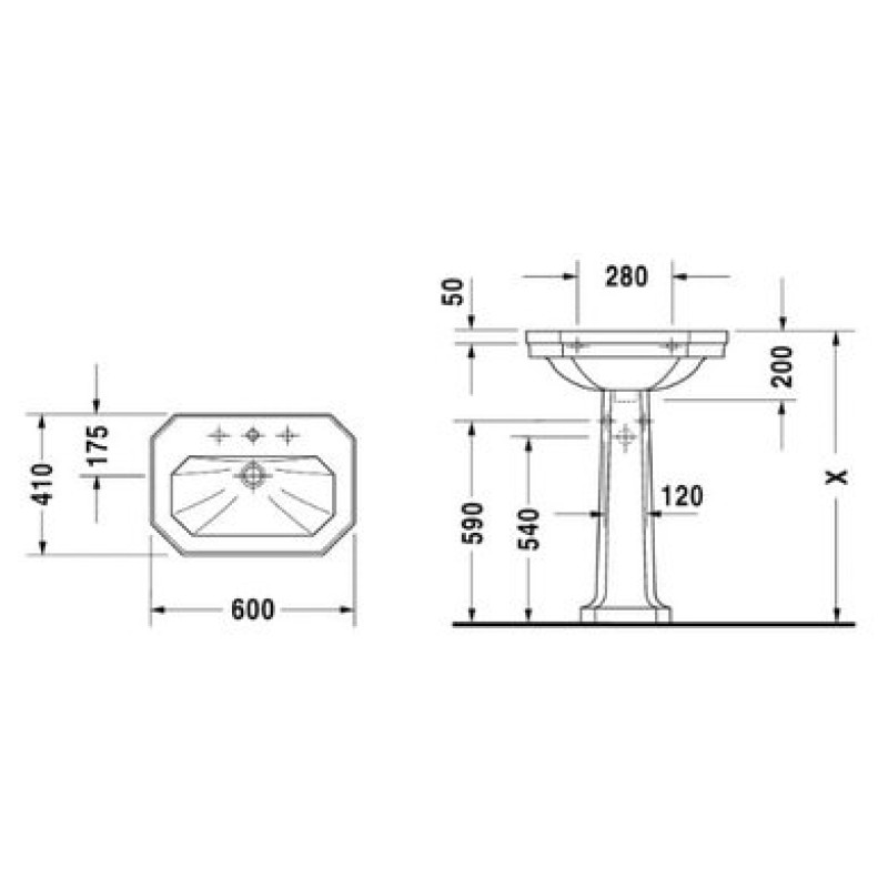 Схема с размерами керамической раковины 60 см Duravit 1930 (0438600000)