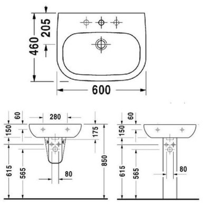 Схема с размерами керамической раковины Duravit D-Code (2310600000)