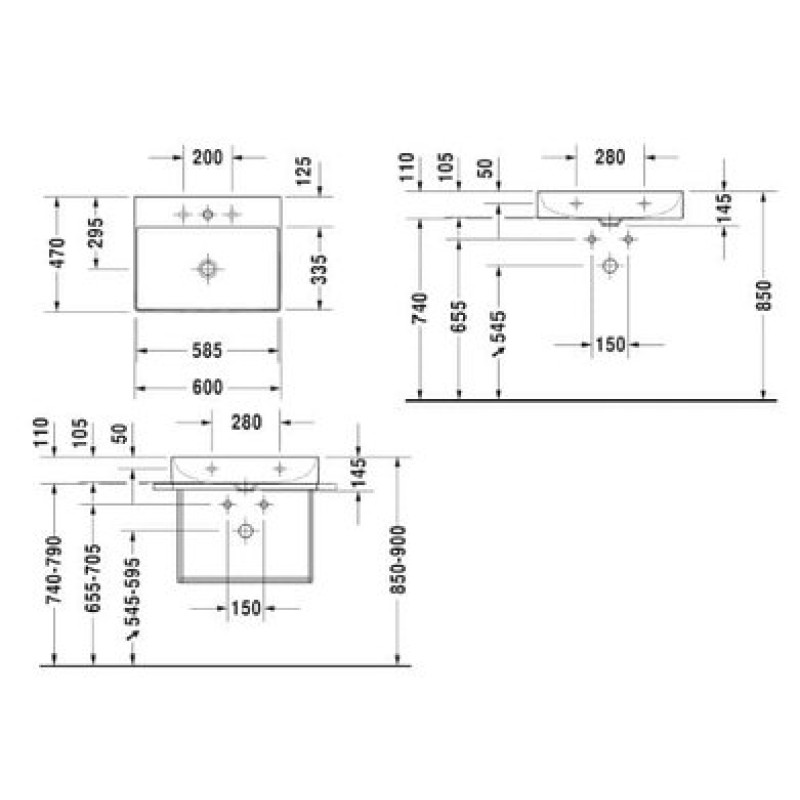 Схема с размерами керамической раковины Duravit DuraSquare (2353600041)
