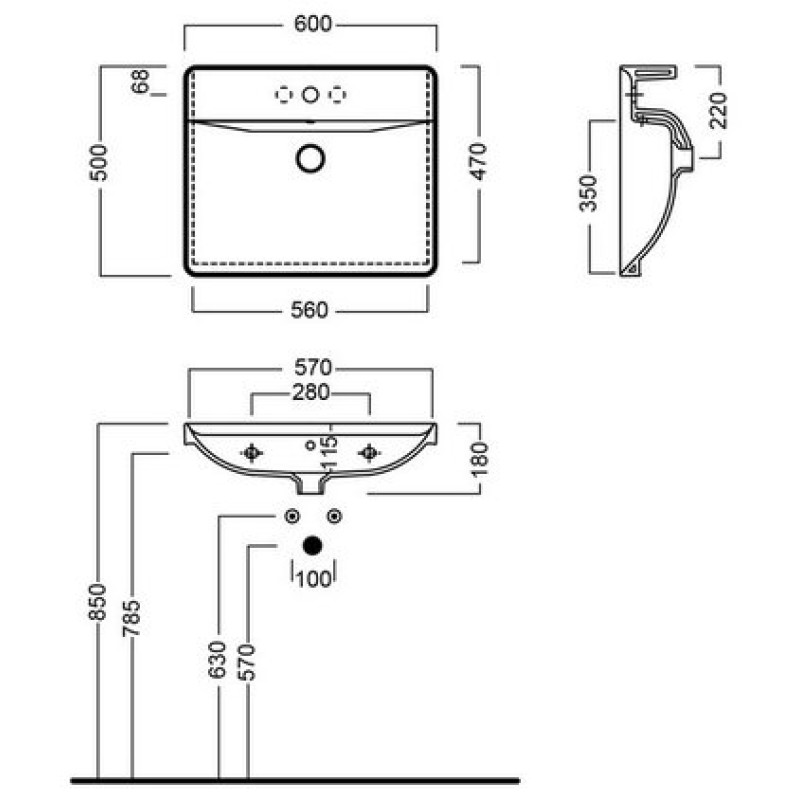 Схема с размерами керамической раковины Hatria Canalgrande (Y1EJ01)