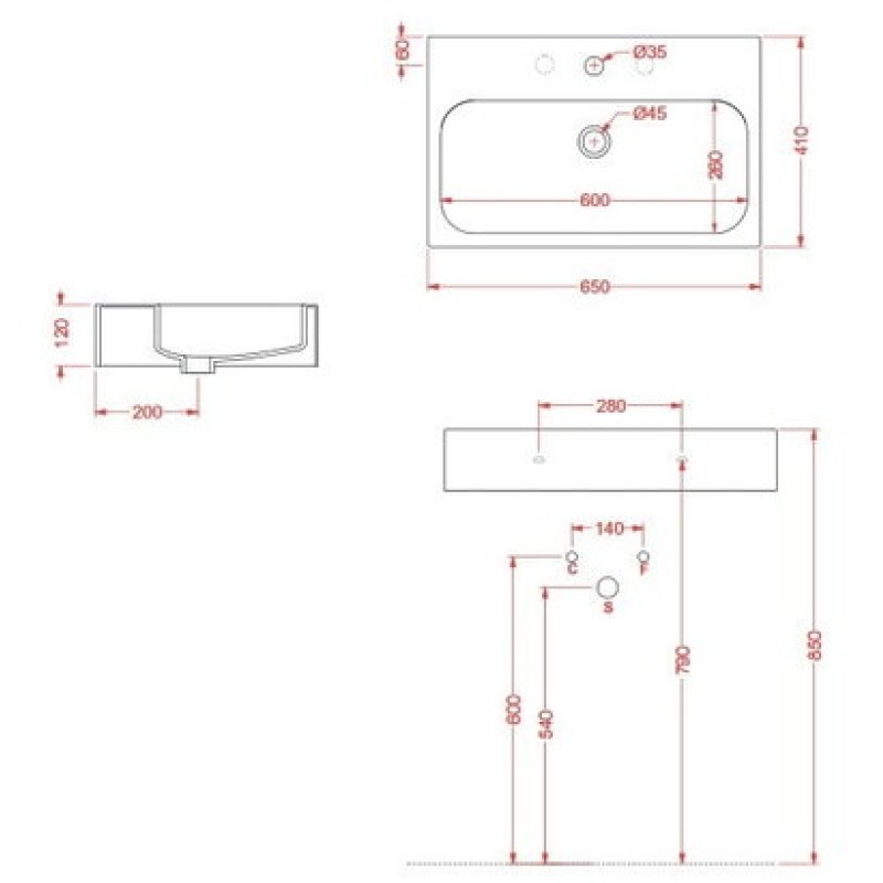 Схема с размерами керамической раковины Artceram Block (BKL001 01; 00)