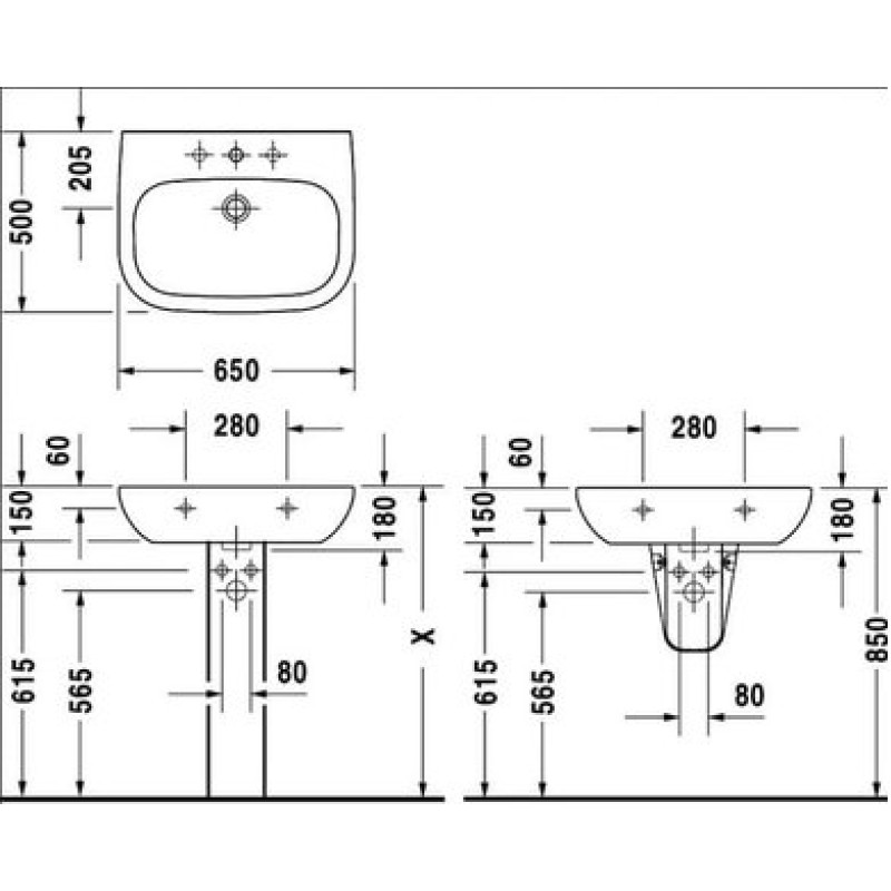 Схема с размерами керамической раковины Duravit D-Code (2310650000)