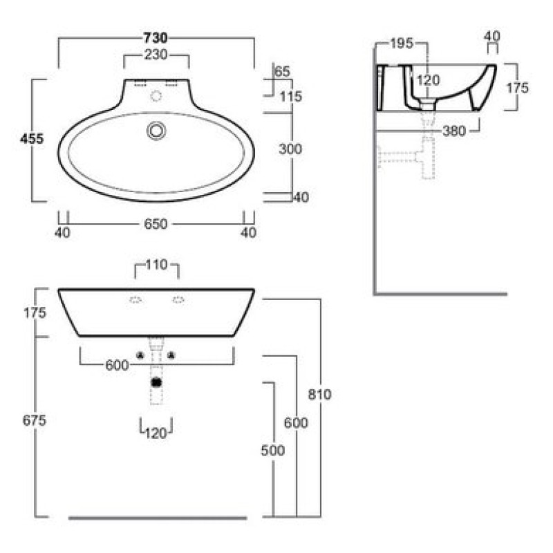 Схема с размерами керамической раковины Simas LFT Spazio (LFT 34)