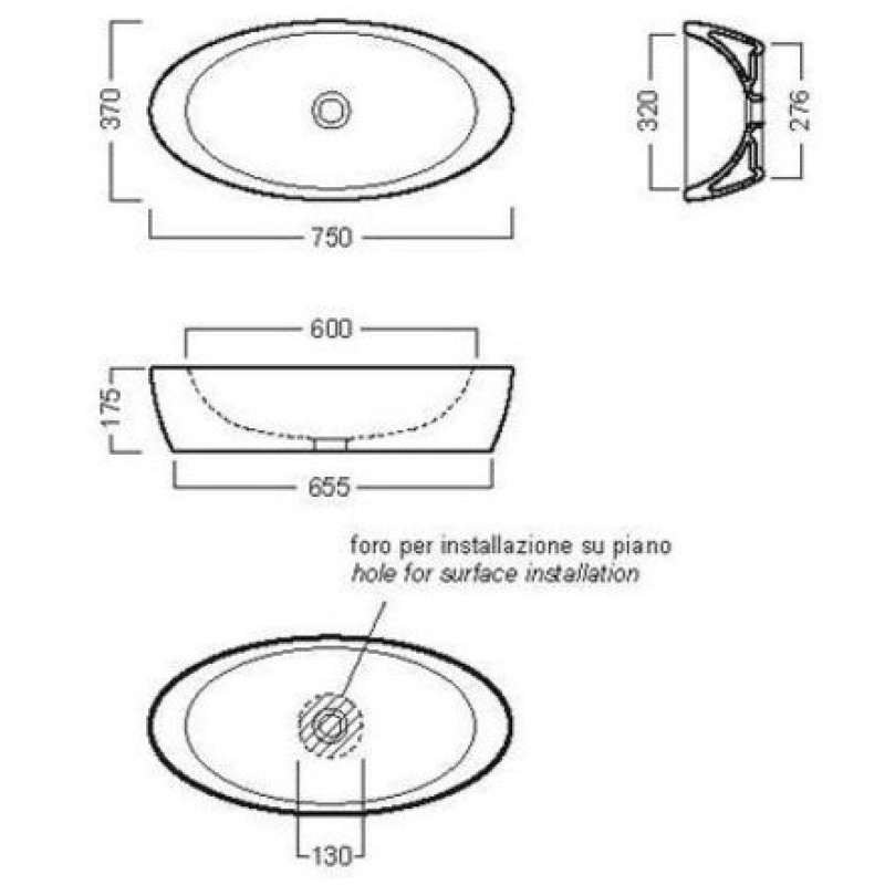 Схема с размерами керамической раковины Hatria Nido (Y0R201)