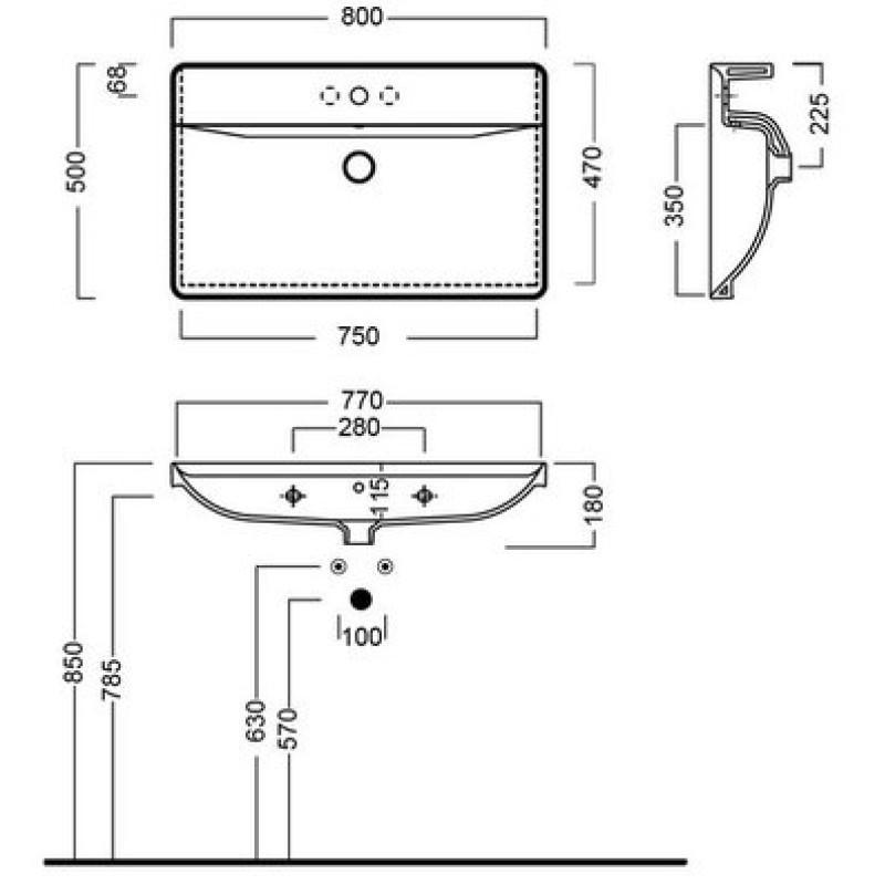 Схема с размерами керамической раковины Hatria Canalgrande (Y1EK01)