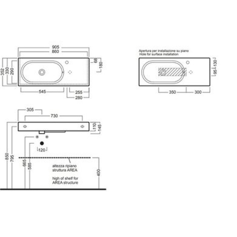 Схема с размерами керамической раковины Hatria Area (YXEQ01)