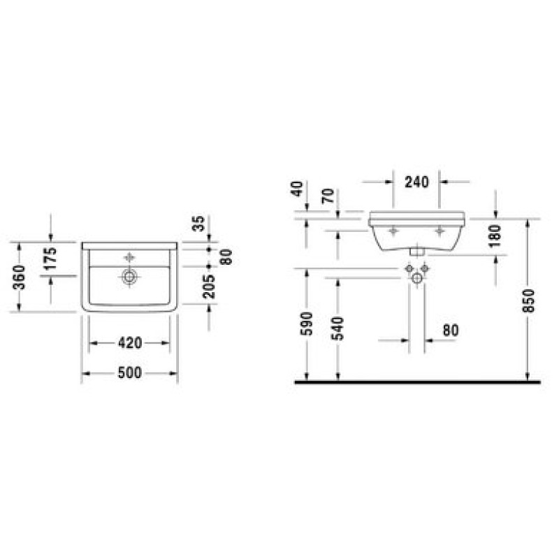 Схема с размерами керамической раковины Duravit Starck 3 (0307500000)