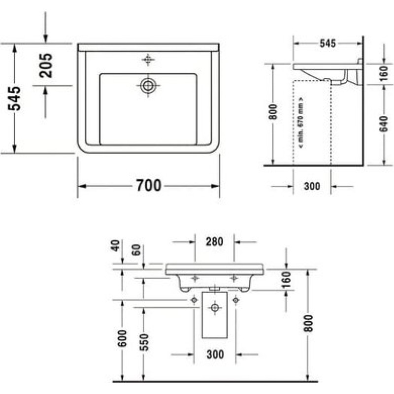 Схема с размерами керамической раковины Duravit Starck 3 (0312700000)