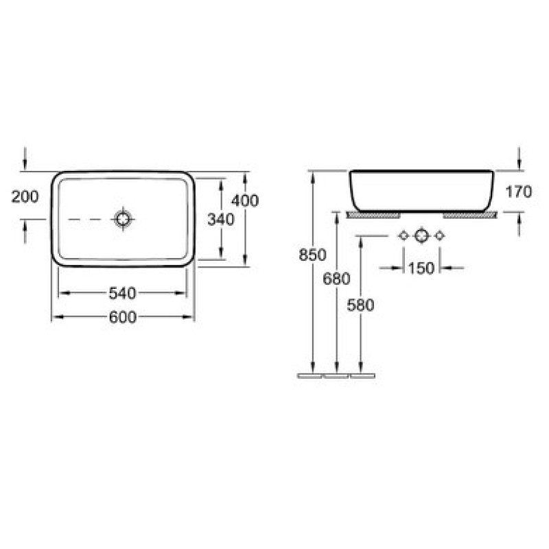 Схема с размерами керамической раковины Villeroy & Boch Architectura 412760R1