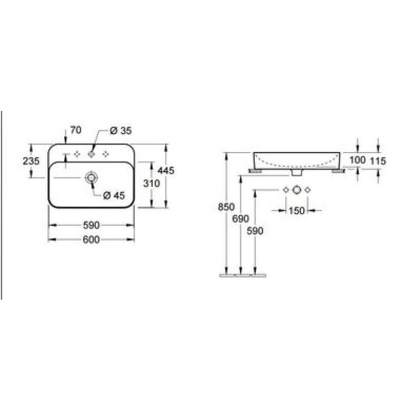 Схема с размерами керамической раковины Villeroy & Boch Finion 414260R1