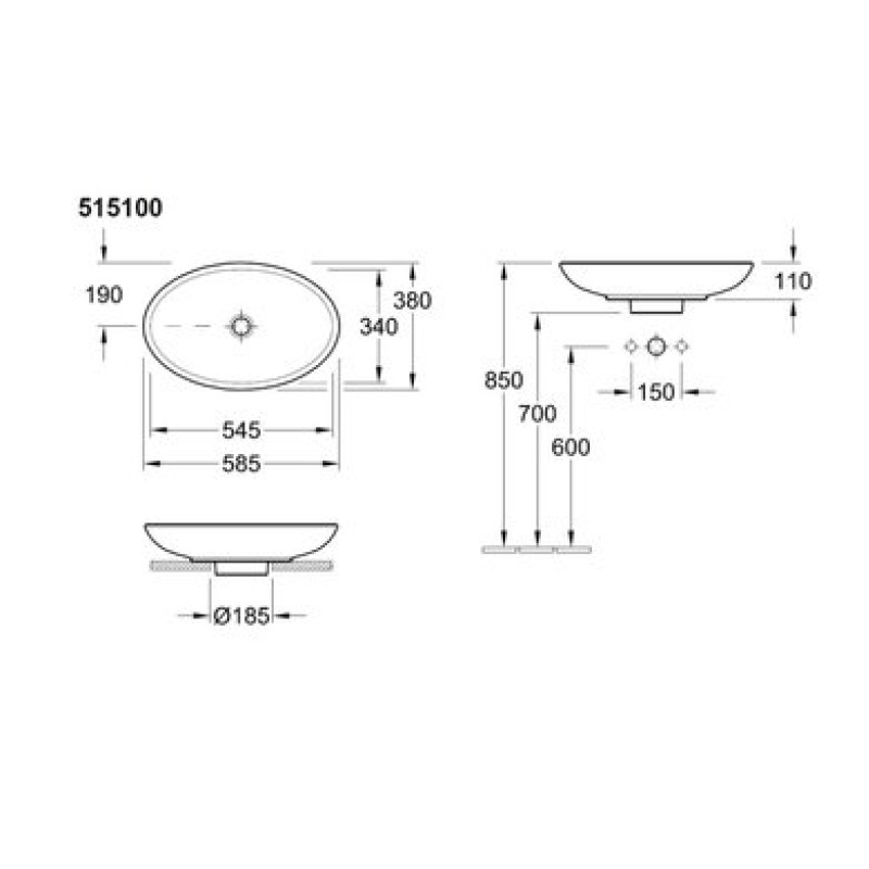Схема с размерами керамической раковины Villeroy & Boch Loop&Friends 515100R1