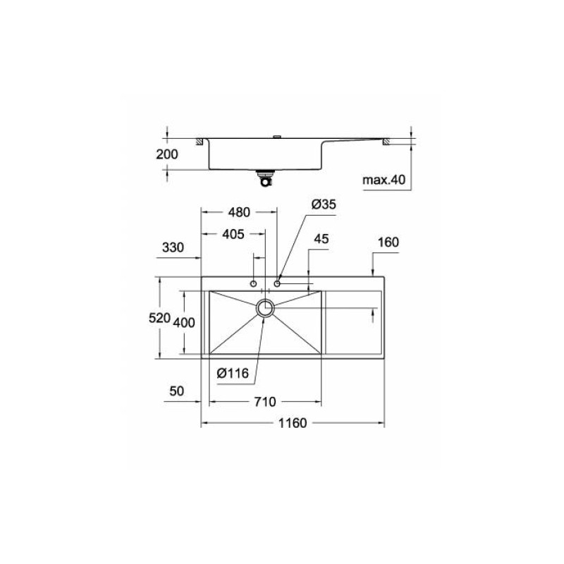 требуемый размер отверстия в столешнице для установки мойки: 1148 x 508 мм