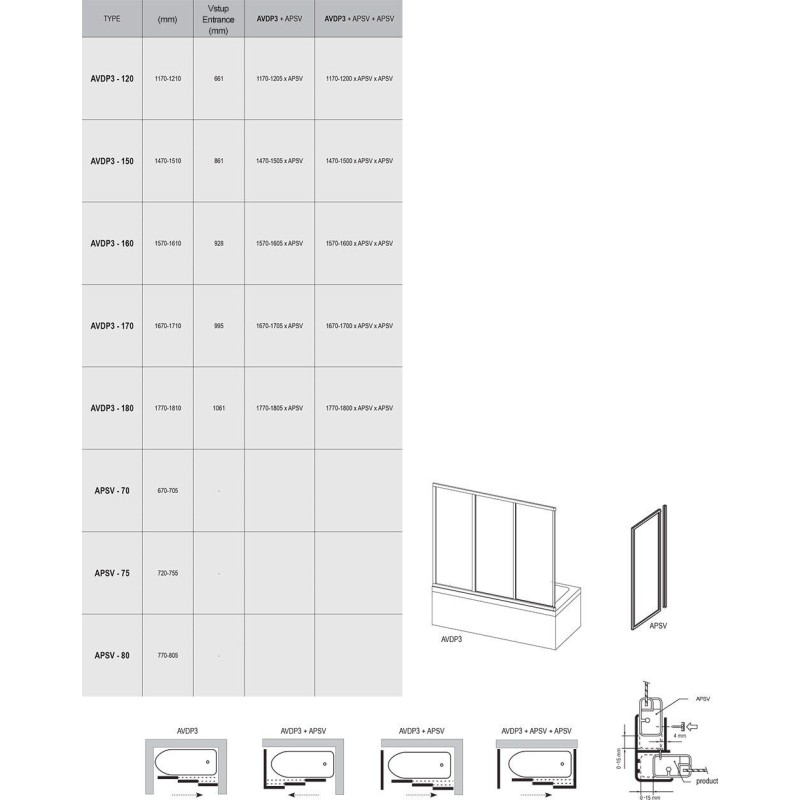 в размерах AVDP3 - 120 / 150 / 160 / 170 / 180 см + APSV - 70 / 75 / 80 см