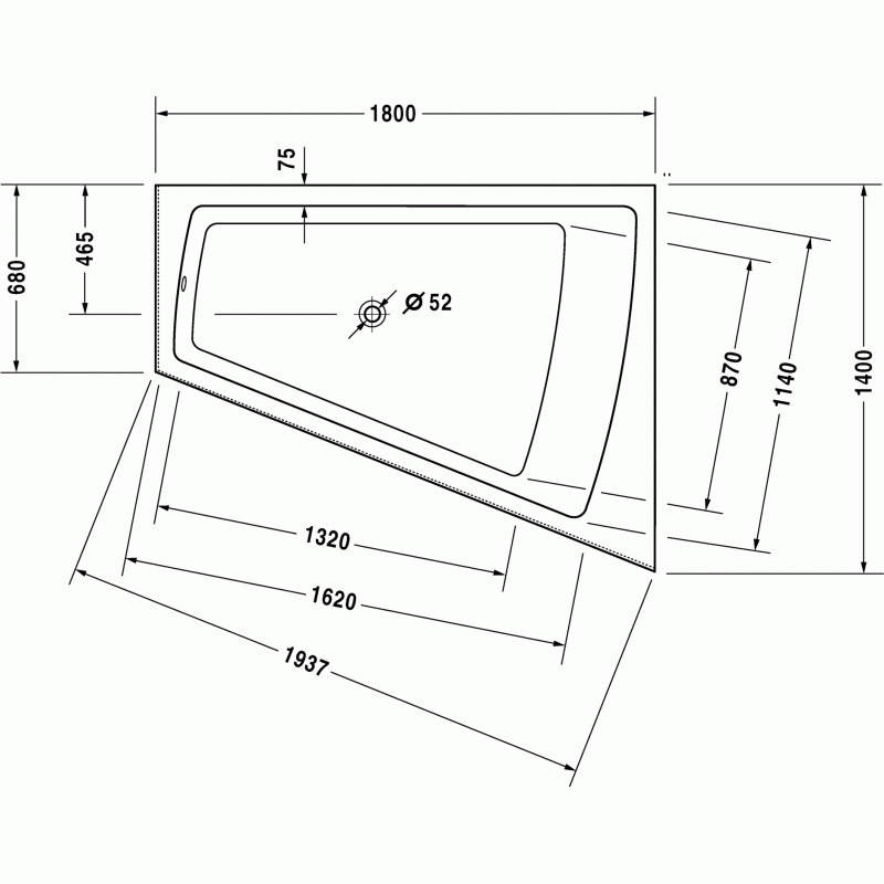 Duravit Paiova ванна асимметричная 180 см, с облицовочной акриловой панелью и рамой, угол справа. Характеристики ванны:Ширина140 смГлубина46 смДлина180 смОбъем295 лВес80 кгМатериал: санитарный акрил
