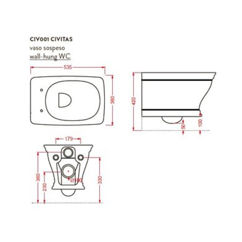 Описание подвесного унитаза Artceram Civitas (CIV001 32; 00) размер 360x540х420 мм вес 21 кг цвет - голубая акварель материал - керамика подвесной монтаж горизонтальный выпуск Схема с размерами подвесного унитаза Artc...