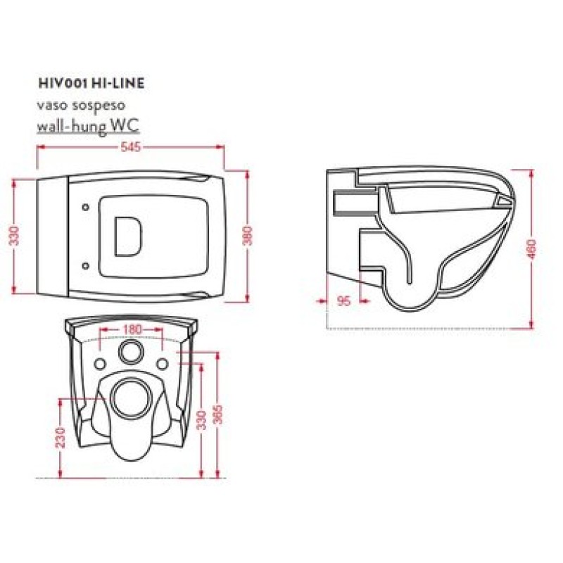 Описание подвесного унитаза Artceram Hi-Line (HIV001 01; 00) размер 380x545х460 мм вес 22 кг цвет - белый глянцевый материал - керамика подвесной монтаж горизонтальный выпуск Схема с размерами подвесного унитаза Artce...