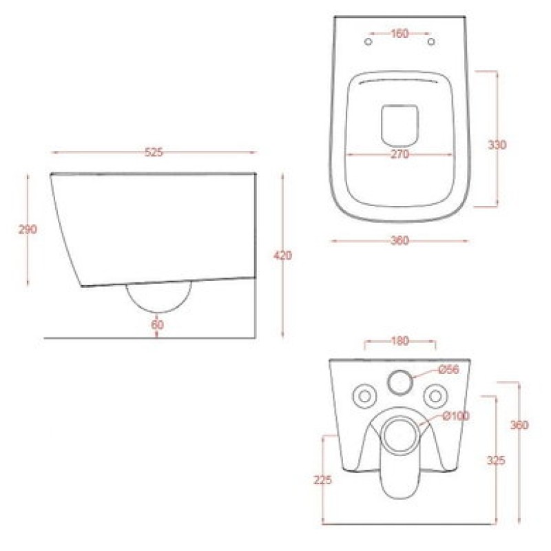 Описание подвесного унитаза Artceram A16 (ASV003 03; 00) размер 360x520х420 мм вес 20 кг цвет - черный глянцевый материал - керамика подвесной монтаж горизонтальный выпуск безободковая чаша Схема с размерами подвесног...