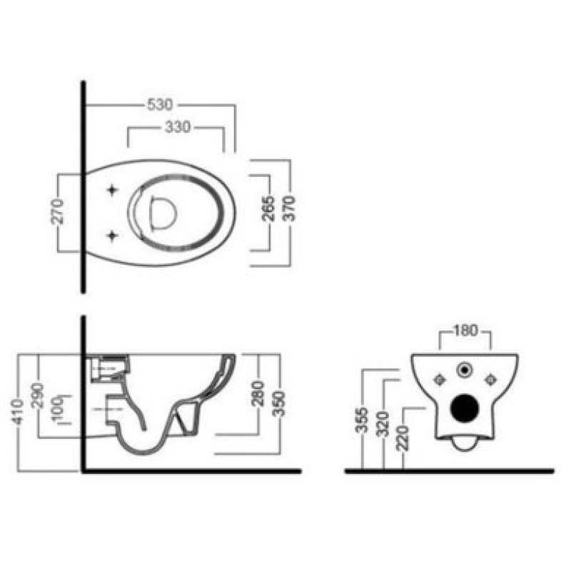 Описание подвесного унитаза Hatria Erika Pro (Y1CB01) размер 370x530х410 мм вес 23 кг цвет - белый глянцевый материал - сантехнический фаянс безободковая чаша подвесной монтаж с горизонтальным смывом Схема с размерами ...