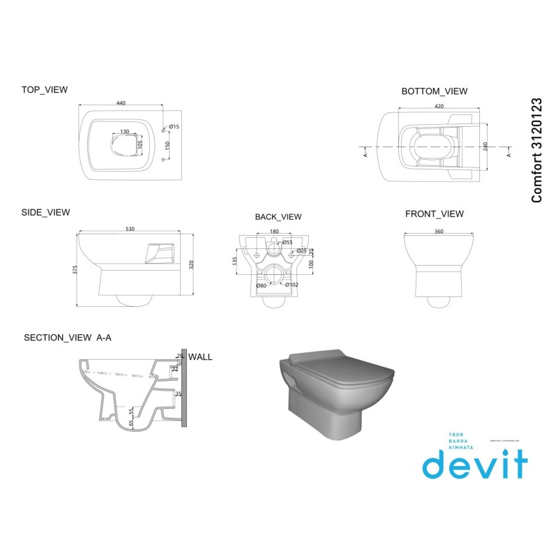 Подвесной унитаз DEVIT COMFORT NEW 3120123 с крышкой softclose тонкой