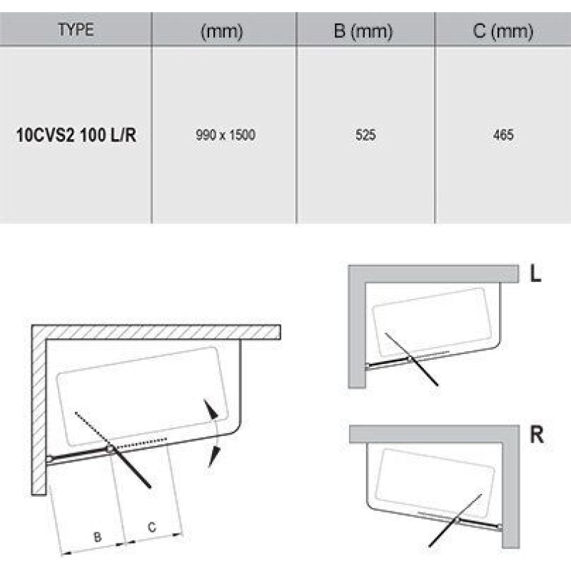 Шторка для ванни двохелементна 10CVS2-100 L Transparent, (7QLA0103Z1) RAVAK — характеристики та опис