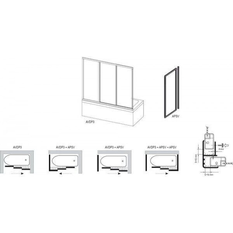 Двери состоят из одной неподвижной и двух подвижных частей. Конструкция составлена из толстостенных алюминиевых профилей с качественной поверхностной обработкой и максимальной герметичностью. Двери подходят для прямоугольных ванн с ровным передним бортом. Двери для ванны AVDP3 подходят для установки в нише (закрытое с трех сторон душевое пространство) или комбинации с неподвижной стенкой APSV.