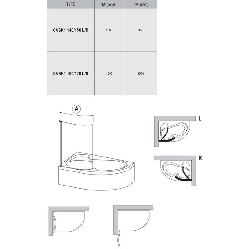 Плитка керамогранит Шторка для ванны Ravak CVSK1 ROSA 160/170 L Белый Transparent для пола