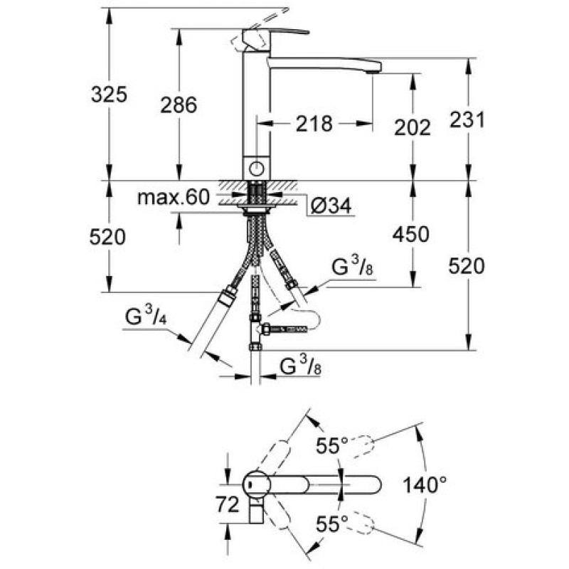 - область поворота 140°