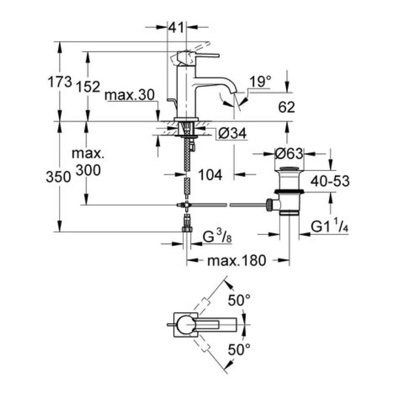 Схема с размерами смесителя для раковины Grohe Allure (32757000)