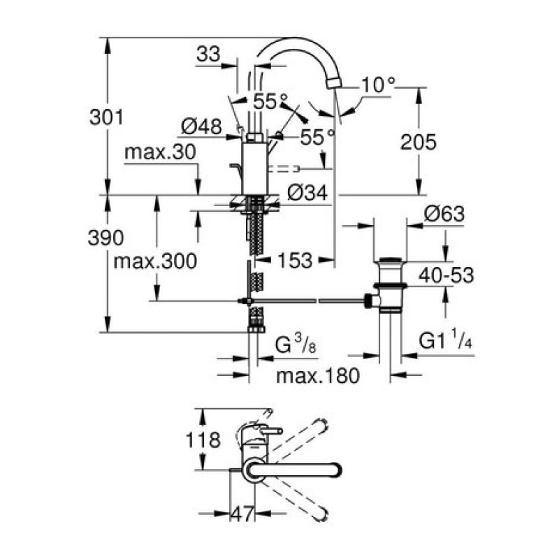 - поворотный, трубкообразный излив с ограничителем поворота