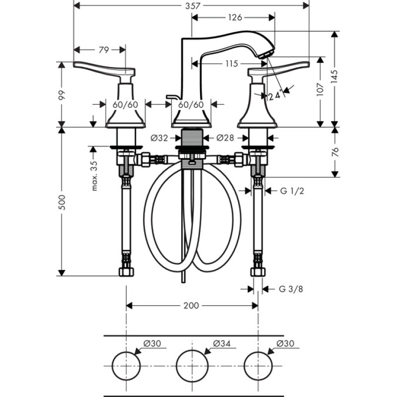 Смеситель для раковины на 3 отверстия Hansgrohe Metropol Classic 110 31330000 — характеристики та опис