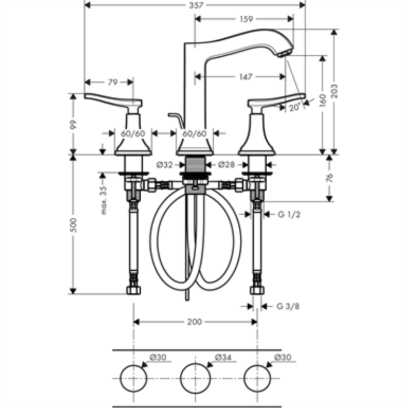 Смеситель для раковины на 3 отверстия Hansgrohe Metropol Classic 160 31331090 — характеристики та опис