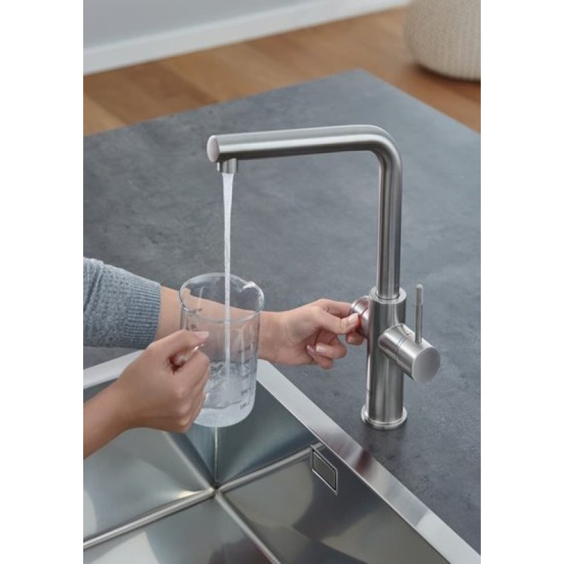 Как мгновенное получение кипятка изменило бы вашу кухню? Узнайте вместе с новым смесителем для кухни GROHE Red DuoВаш чайник заставлял вас ждать. Но смеситель GROHE Red Duo предлагает вам воду, мгновенно нагретую до 100°: для этого нужно всего лишь нажать на кнопку - и вы сможете решать кухонные задачи намного быстрее. Смеситель выполнен в утонченном, минималистичном дизайне. Кипяток отлично подходит для заваривания чая и кофе, а также для приготовления пищи и наполнения кастрюль. Функция подачи кипятка активируется с помощью нажатия на кнопку, которая защищена от использования детьми. Высокий L-образный излив делает наполнение больших емкостей простым, а угол его поворота может быть зафиксирован в точках 0°/150°/360°, что увеличивает удобство использования. Технология GROHE SilkMove обеспечивает плавность и точность управления рычагом смесителя. При использовании этого продукта главное - безопасность: благодаря автоматической блокировке GROHE ChildLock ребенок не сможет случайно открыть воду и обжечься. Разряд энергоэффективности продукта - A, что позволяет перевести бойлер в режим каникул - в этом состоянии температура воды будет ограничена 60° C. Способный мгновенно предоставить до 3 л кипятка, бойлер сделан из титана для превосходной защиты от коррозии, а стильное матовое покрытие смесителя в цвете "суперсталь" останется таким же великолепным в течение долгих лет. Фильтр GROHE Red очищает воду от тяжелых металлов и извести, увеличивая срок жизни как бойлера, так и смесителя. Покупателям также будет интересно приобрести смешивающий вентиль Coldfill (40841001) на замену кухонных смесителей для открытых водонагревателей. Вентиль смешивает холодную воду с кипятком, мгновенно предоставляя вам теплую воду. Это означает, что вам больше не нужно будет ждать, пока вода нагреется и, как следствие, вы потратите меньше воды.