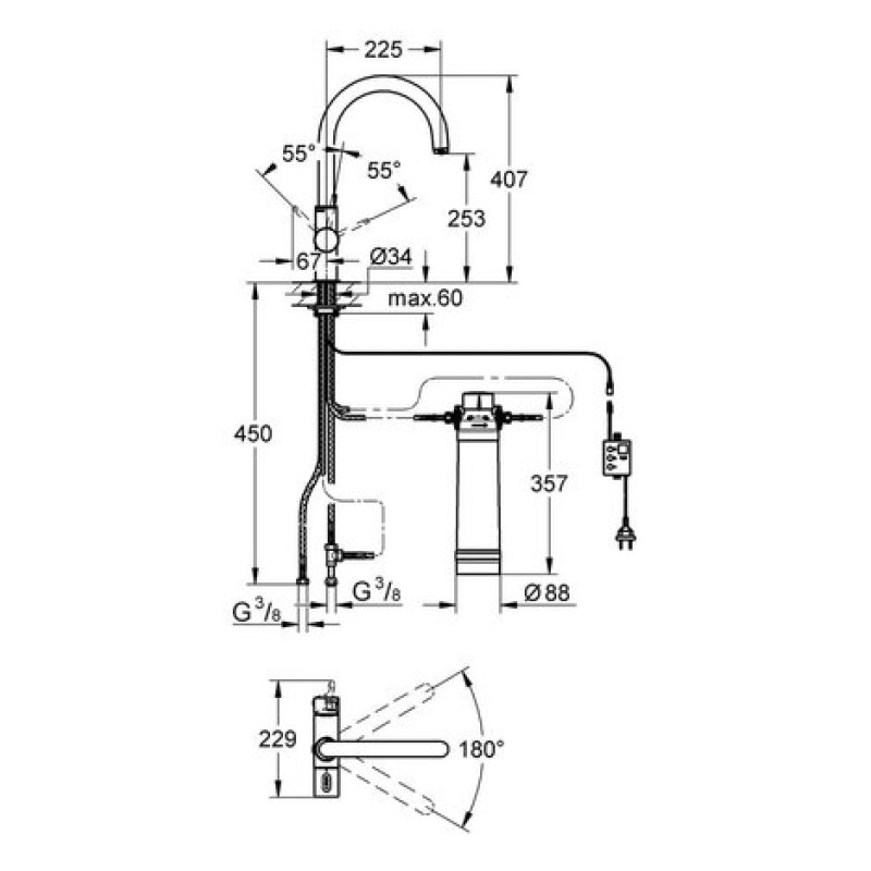 GROHE Blue Pure — альтернативное решение для тех, кто предпочитает естественный вкус питьевой воды. За счет уникальной технологии фильтрации GROHE Blue эта система превращает обычную водопроводную воду в свежую питьевую, очищенную от всех примесей, ухудшающих ее вкус. Смеситель с хромированным покрытием GROHE StarLight® имеет раздельные внутренние протоки для фильтрованной и для нефильтрованной воды. Данная система позволит наслаждаться великолепным вкусом воды GROHE Blue и тем, кто предпочитает простую питьевую воду без газирования. Фильтр GROHE Blue рассчитан на фильтрацию до 600 литров воды и легко подлежит замене. Вода, получаемая из этой системы, имеет чистый, освежающий вкус без привкуса извести, хлора и тяжелых металлов.