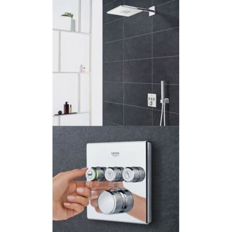 С опциями управления потока воды на ванну, верхний и ручной душ, а также благодаря его безупречному дизайну, термостат скрытого монтажа Grohtherm SmartControl в цвете "белая луна" одновременно практичен и красив. Инновационная технология SmartControl позволит вам регулировать напор воды с помощью нажатия и поворачивания кнопки. Три вентиля предлагают абсолютное удобство в зависимости от ваших настроен - вы можете контролировать, переключаться или комбинировать различные режимы струи и выходы воды, что идеально подойдет для тех, кто хотел бы использовать ручной, верхний и боковые души, а также ванну. Встроенная технология GROHE TurboStat предотвратит неприятные скачки температуры. Маркировка EasyLogic и иконки на кнопках с заменяемыми символами делают использование термостата интуитивно понятным. Кнопка GROHE SafeStop позволит вам установить максимальную температуру в 38°C, что предотвратит ошпаривание, а ограничитель температуры GROHE SafeStop Plus предоставит опцию увеличить максимум температуры до 43°C для большего уровня безопасности. Водосберегающая технология GROHE EcoJoy поможет сократить расход воды без ущерба для комфорта при принятии душа. Благодаря системе GROHE QuickFix термостат легко установить. Тонкий профиль термостата делает его поддержание в чистоте очень простым, а надежное хромовое покрытие GROHE StarLight сохранит свой блеск на долгие годы. Благодаря его утонченному современному дизайну, термостат сможет усовершенствовать дизайн вашей ванной комнаты. Пожалуйста, обратите внимание, что этот продукт должен быть установлен в комбинации с универсальной встраиваемой частью GROHE Rapido SmartBox (35600000).