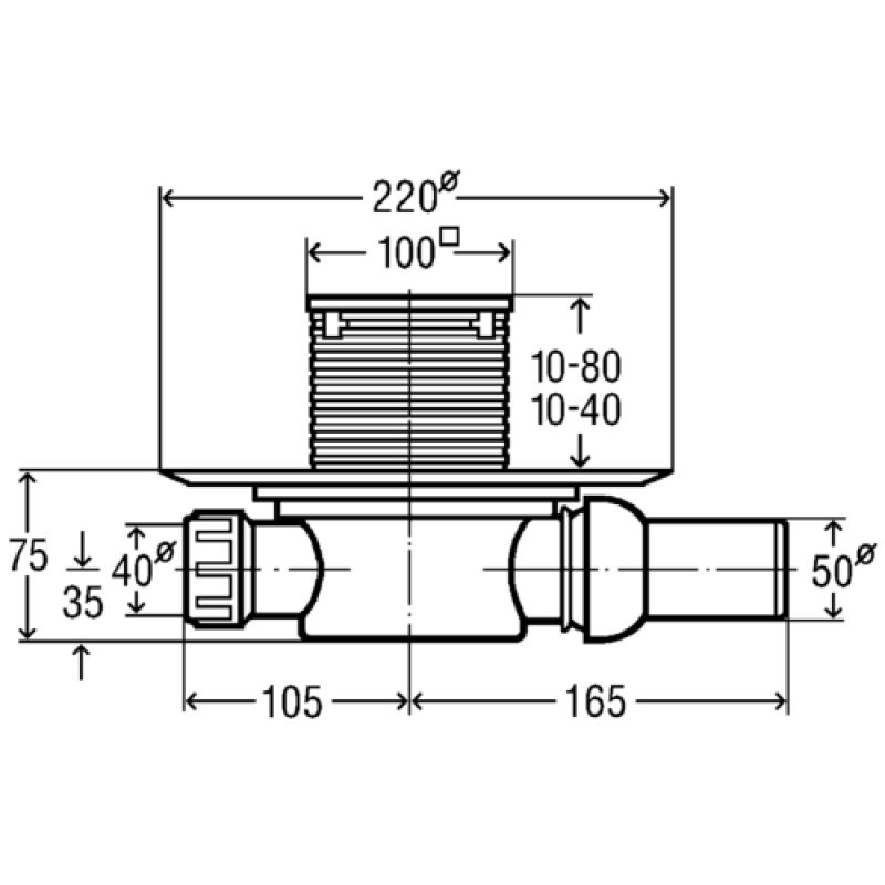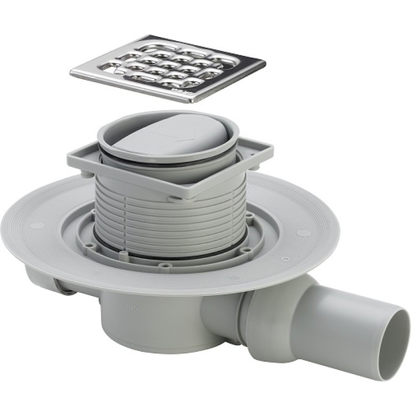 Трап для ванной комнаты, высота столба жидкости в гидрозатворе 30 мм, класс нагрузки K=300 кг, в комплектацию входит : поворотная и регулируемая по высоте насадка 100x100 мм, заглушка, штампованная решетка из нержавеющей стали 1.4301, фланец для нанесения/закрепления гидроизоляции, съемное устройство для защиты от неприятного запаха из системы канализации, ввод для подключения дополнительных сантехприборов DN40, выпуск на шарнирном соединении