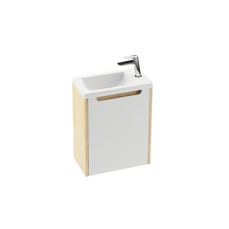 Добавит шика простому миниумывальнику. Белые высокоглянцевые дверцы, имеющие эргономичный вырез, выполняющий функцию ручки, заказываются отдельно в Л/П вариантах. Шкафчик оснащен полкой.