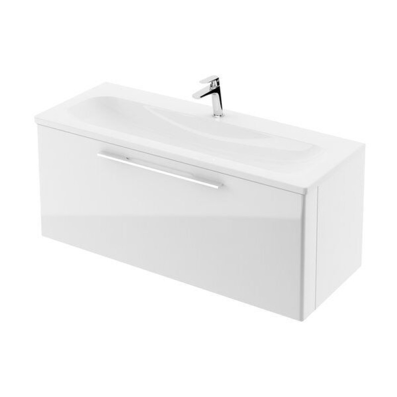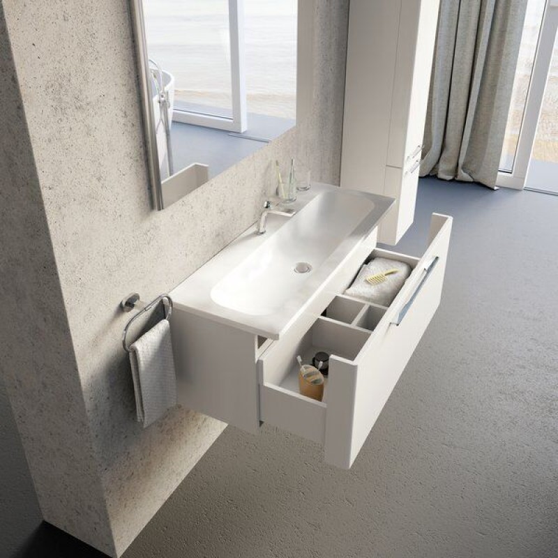 Горизонтальное исполнение шкафчика с умывальником обеспечивает больше свободного пространства в ванной комнате и ее центральной части, а таже больше места для хранения вещей. Шкафчик предназначен под умывальник Ring 800.