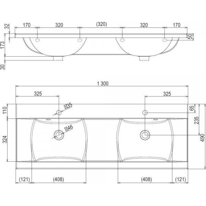 - Размер 1300 х 490 мм, отверстие под смеситель 35 мм