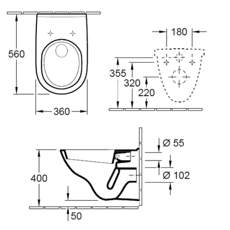 Чертеж с размерами унитаза под скрытую инсталляцию Villeroy&Boch O.NOVO (5660H101)