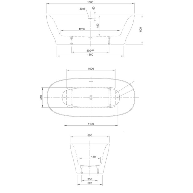 - Размер ванны 1800х800x600 (450) мм