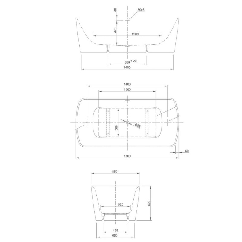- Размер ванны 1800х850x600 (420) мм