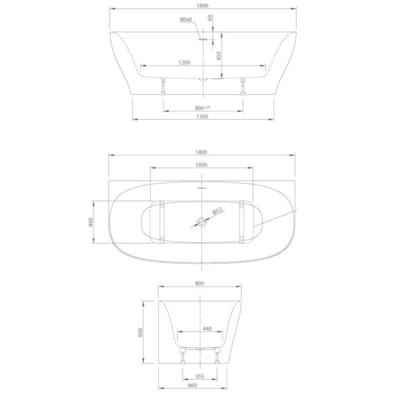 - Размер ванны 1800х800x600 (450) мм