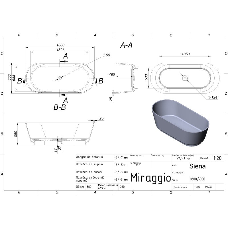 Miraggio имеет большой выбор отдельно стоящих ванн. Ванна SIENA из литого мрамора - это отдельный вид искусства. Литой мрамор — твердый и долговечный материал. Основным компонентом смеси является молотая мраморная крошка, которую смешивают с полиэфирными смолами. Ванна SIENA из литого мрамора на внешней поверхности покрывается антибактериальным гелем Gelcoat ISO NPG, который делает устойчивыми к воздействию внешних факторов.
