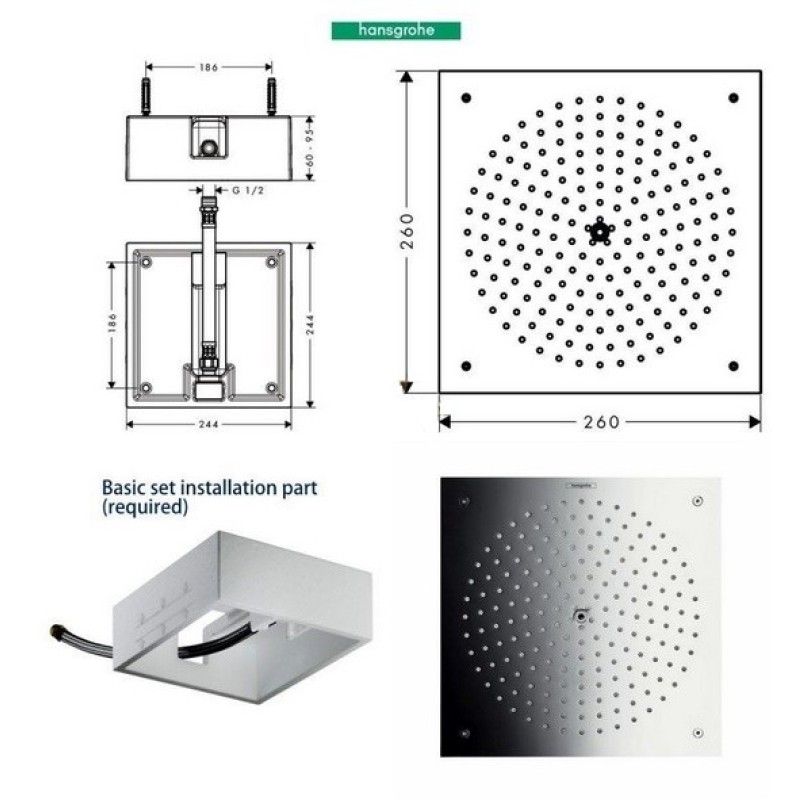 для монтажа необходим артикул: 26471180размер душевого диска: 260 ммтип струи: RainAirрасход воды для струи RainAir (при 3 бар): 15 л/минполностью хромированный душевой дискматериал душевого диска: металлсъемный душевой ...