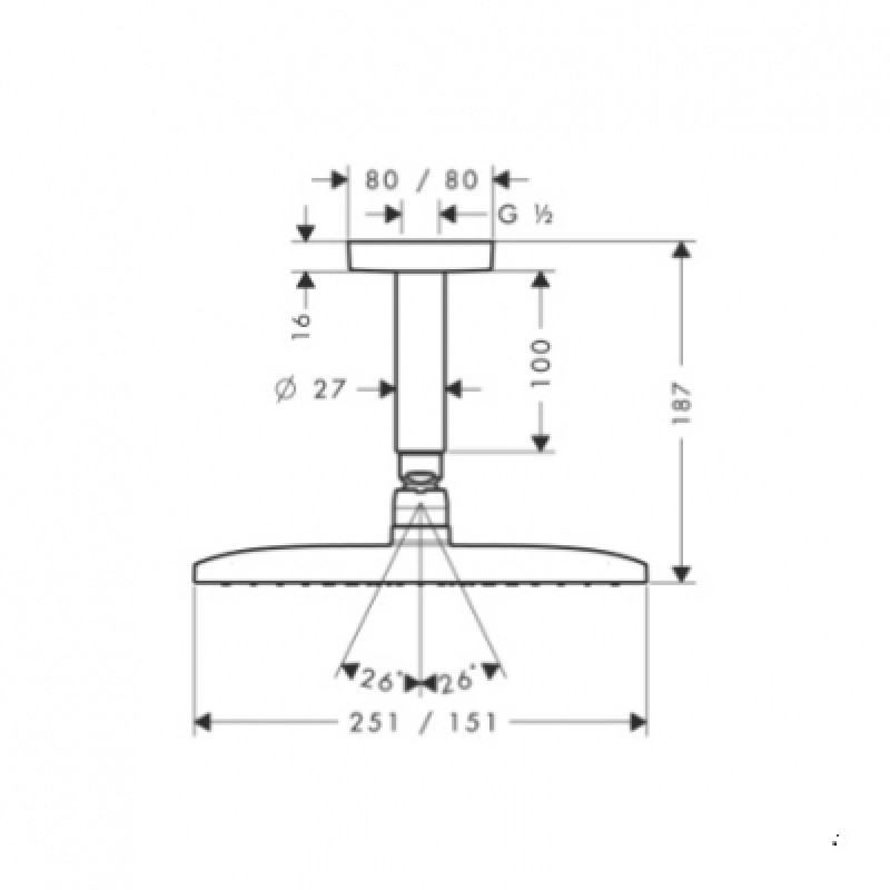 размер душевого диска: 250 x 150 ммтип струи: RainAirрасход воды для струи RainAir (при 3 бар): 20 л/минполностью хромированный душевой дискматериал душевого диска: металлсъемный душевой диск для очисткидлина потолочного...
